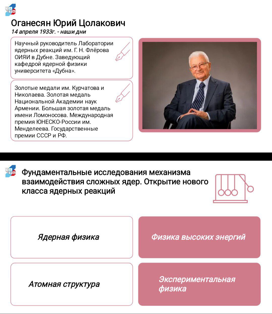 Второй проект– буктрейлер «OGANESSON», посвященный биографии академика Юрия Цолаковича Оганесяна. Сценарий Григорий написал лично, а съёмочный процесс занял всего две недели. Премьера прошла в московской Школе № 1474 на научно-просветительских чтениях. Но главное признание ждало команду впереди. Сам Юрий Цолакович Оганесян высоко оценил работу Григория и его команды и пригласил их в Объединенный институт ядерных исследований (ОИЯИ) в Дубне. Для молодого человека, поступающего на продюсерский факультет, получить личное приглашение от ученого с мировым именем – огромный успех и доказательство того, что его творческий язык понятен даже строгому академическому сообществу.