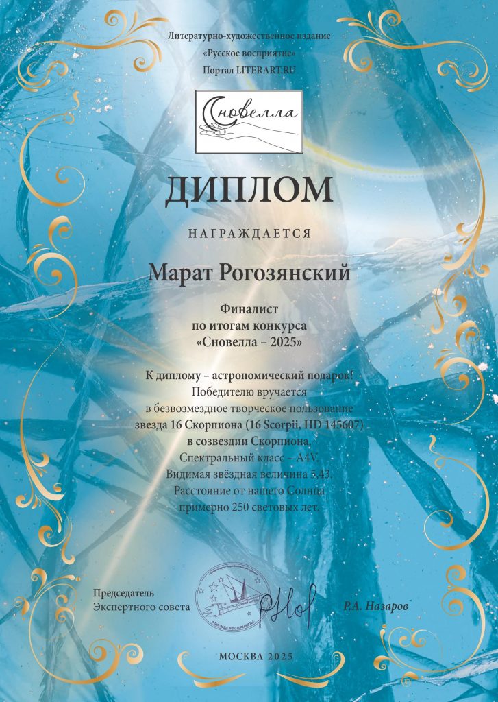 Декан сценарного факультета ГИТРа М. Э. Рогозянский, впервые участвовавший в конкурсе «Сновелла», стал Дипломантом этого конкурса 2025 года в номинации «Эмпатия и волшебство». Победитель-финалист получил впридачу к диплому астрономический подарок: в безвозмездное творческое пользование звезду 16 Скорпиона (16 Scorpii, HD 145607) в созвездии Скорпиона. Спектральный класс – А4V. Видимая звёздная величина 5,43. Расстояние от нашего Солнца примерно 250 световых лет.