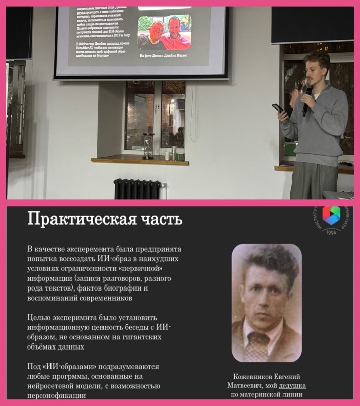 Матвей Елисеев буквально потряс аудиторию своим кейсом с созданием ИИ-образа собственного дедушки, ушедшего из жизни тринадцать лет назад. Целью эксперимента было установление информационной ценности беседы с ИИ-образом, основанном на гигантских объемах данных. Результаты Матвей озвучил в докладе: «Потенциал использования ИИ-агентов для проведения информационного интервью с умершими людьми».