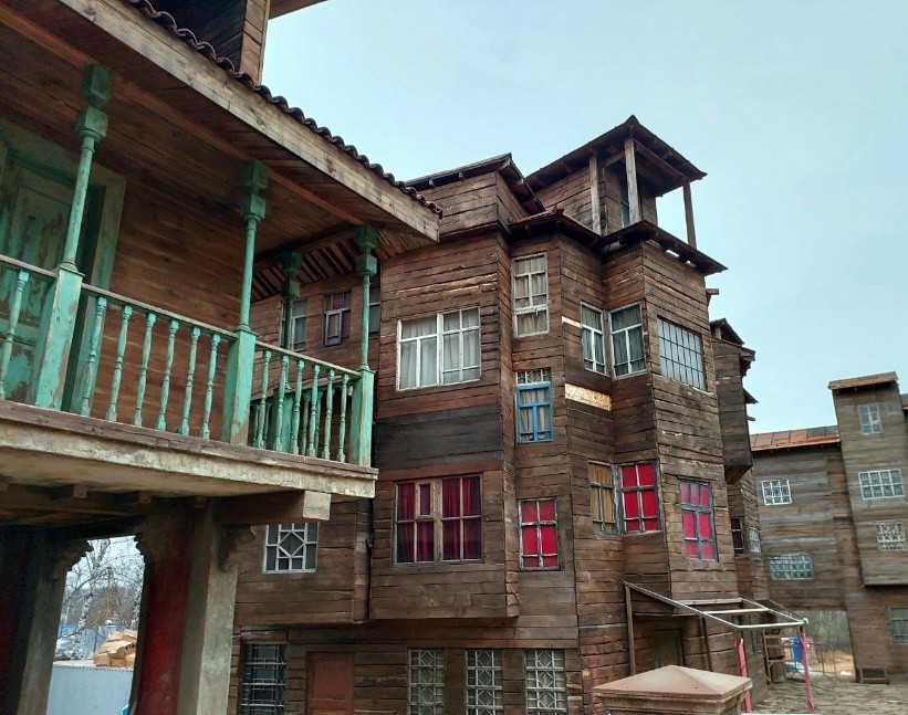 Поначалу, оказавшись в локации, думаешь: «Наверное, тут просто быстро построили настоящие дома, похожие на старые постройки», — но на самом деле конструкция состоит из пенопласта, покрывающего железные балки. А уже поверх него накладывается бутафорский материал, повторяющий фактуру бетонных стен. Имитация дерева создается из материала, очень похожего на гипсокартон, который сверху покрывается привычной глазу фактурой.