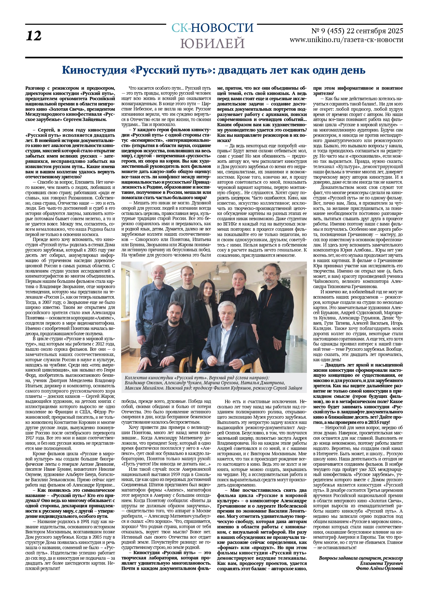 В газете «СК-новости» (газета Союза кинематографистов) вышло интервью зав. кафедрой драматургии ГИТРа с режиссёром и художественным руководителем киностудии «Русский путь» Сергеем Зайцевым. В этом году киностудии исполняется 20 лет. Елизавете Сергеевне Трусевич как сценаристу и режиссеру довелось работать на этой студии, сделать два фильма. В интервью с Сергеем Зайцевым – об истории киностудии, о серии фильмов «Русские в мировой культуре» и о языке документального кино в целом.