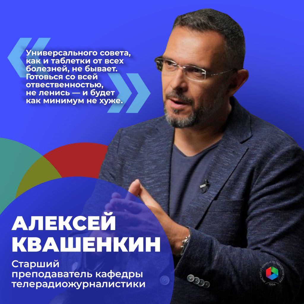 Алексей Евгеньевич Квашенкин — старший преподаватель кафедры телерадиожурналистики ГИТР, репортер, продюсер, автор фильмов — развеивает домыслы о профессии.