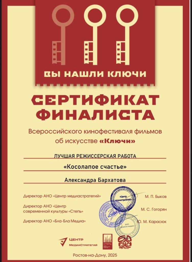 • Финалист в номинации «Лучшая режиссерская работа» — «Косолапое счастье», реж. Александра Бархатова