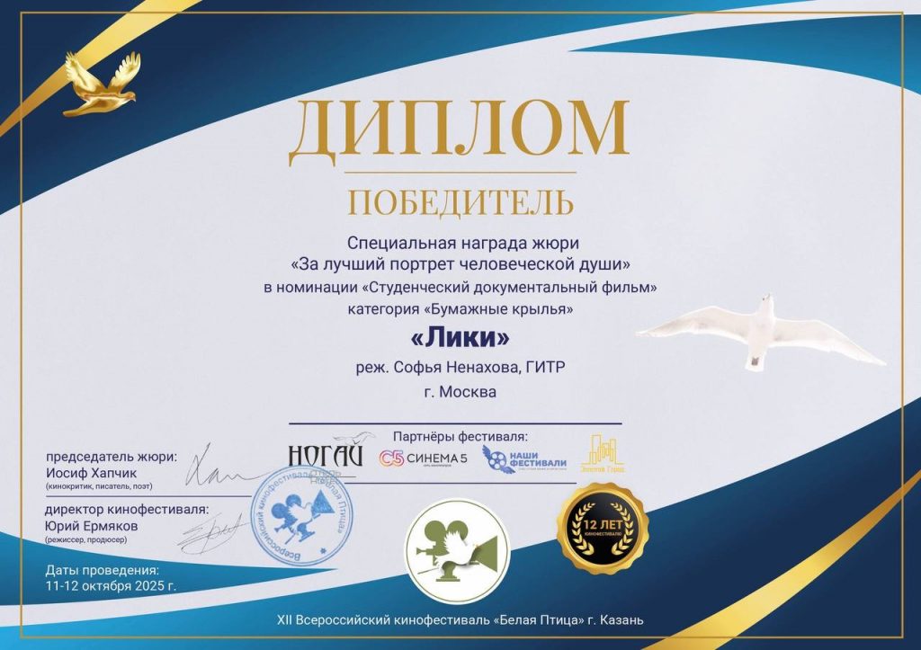 Следом за успехами на фестивалях «Зилант» и «Крылатый Барс», студенты документальной мастерской кафедры режиссуры Института кино и телевидения (ГИТР) вновь возвращаются с победами сразу на нескольких кинофестивалях!