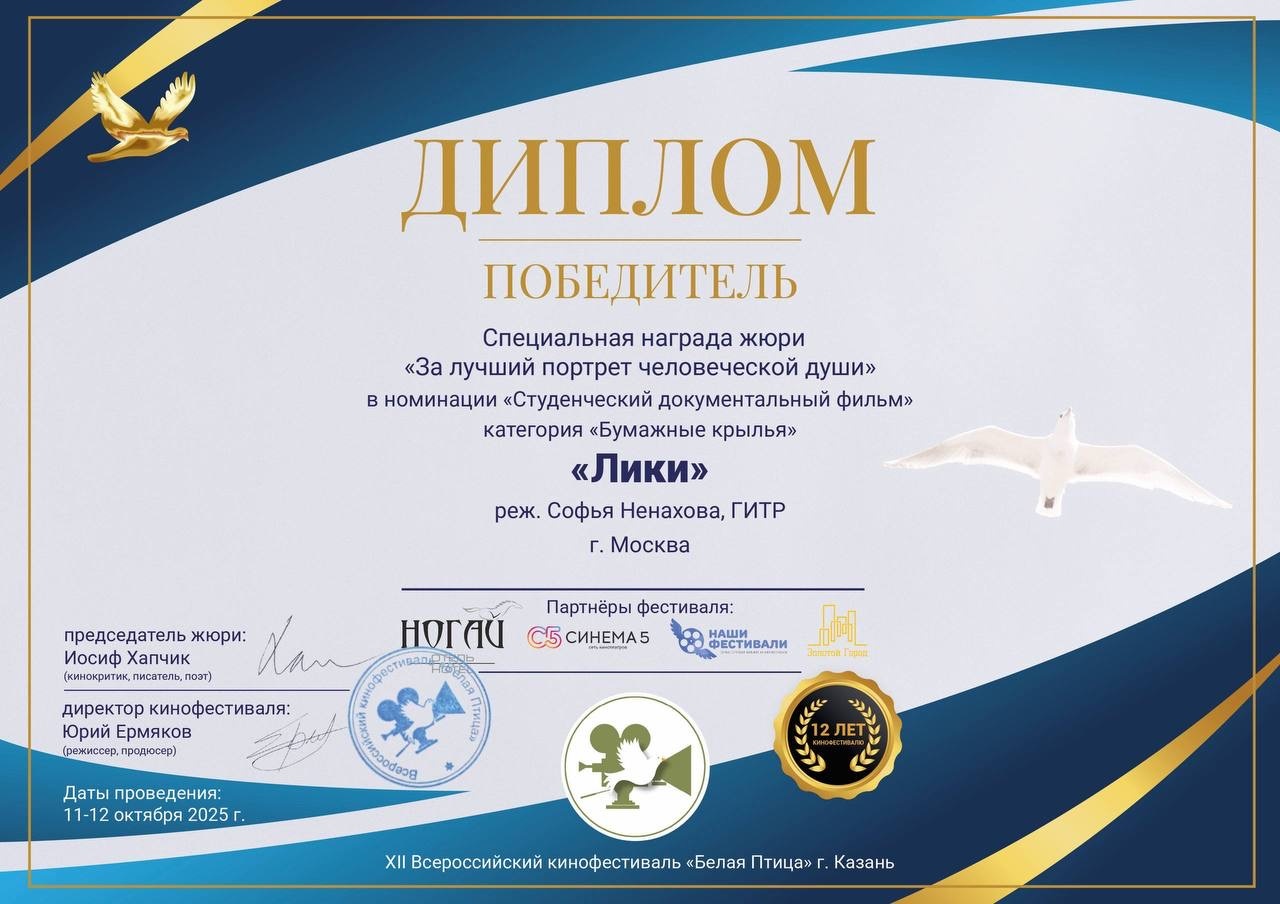 • Специальная награда жюри «За лучший портрет человеческой души»в номинации «Студенческий документальный фильм, категория «Бумажные крылья» — «Лики», реж. Софья Ненахова