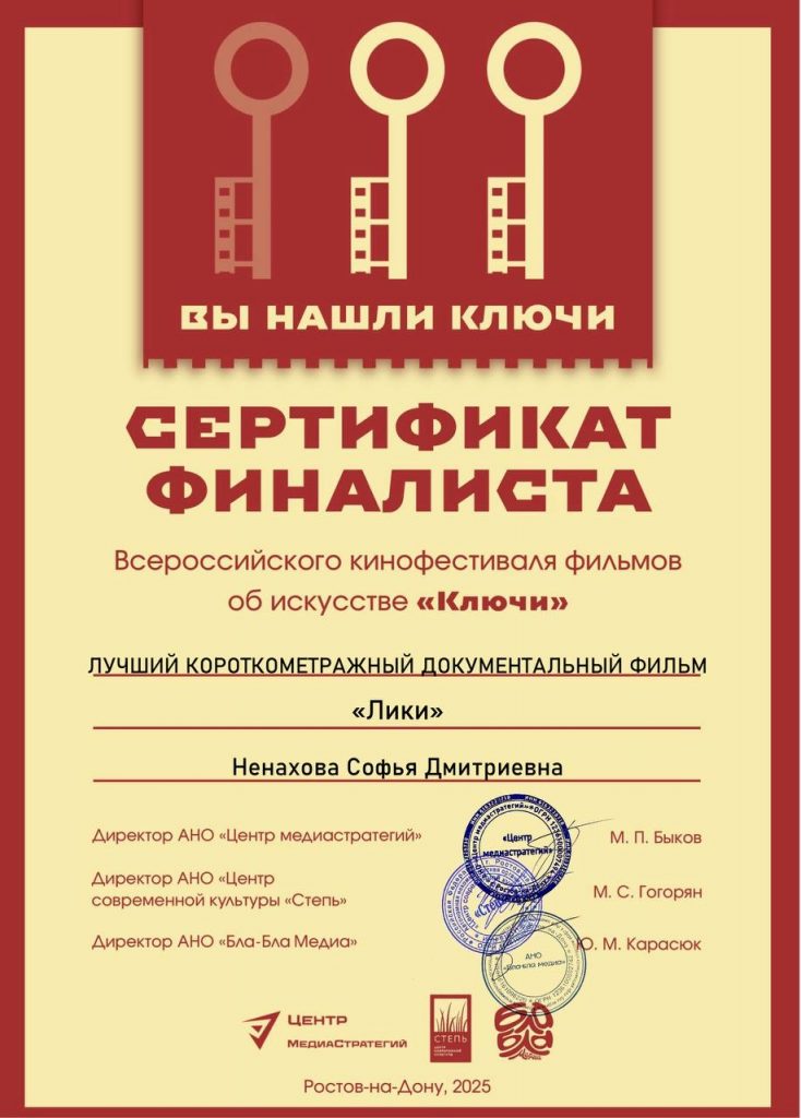 • Финалист в номинации «Лучший короткометражный документальный фильм» — «Лики», реж. Софья Ненахова