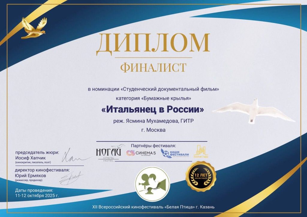 • Финалист в номинации «Студенческий документальный фильм, категория «Бумажные крылья» — «Итальянец в России», реж. Ясмина Мухамедова