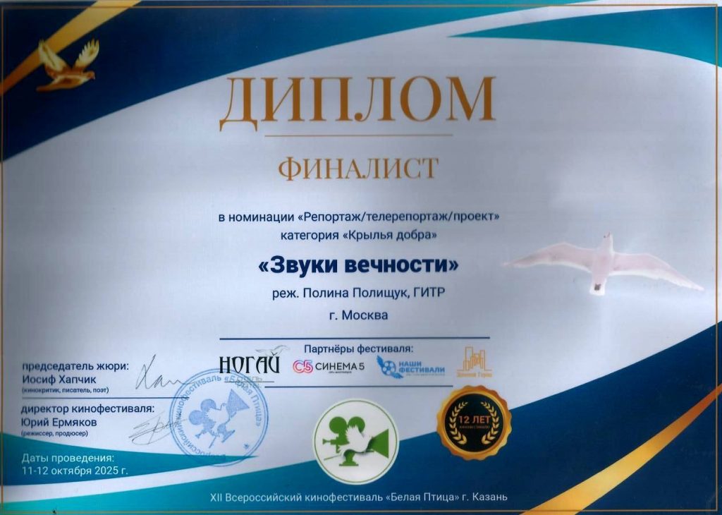 • Финалист в номинации «Репортаж/телерепортаж/проект», категория «Крылья добра» — «Звуки вечности», реж. Полина Полищук