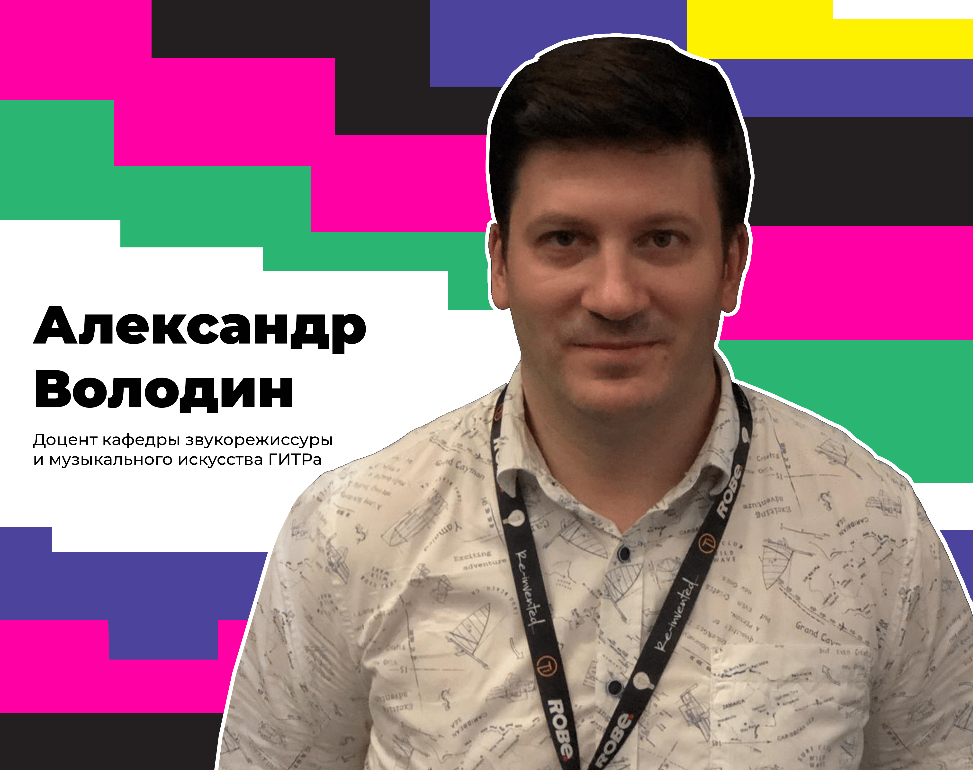 На вопрос абитуриента отвечает Александр Сергеевич Володин, доцент, звукорежиссёр киноконцерна «Мосфильм», выпускник факультета звукорежиссуры ГИТРа. Осуществлял звуковой дизайн 38 фильмов и сериалов. Среди них: «12», «Утомленные солнцем 2», «Елена», «Белый тигр», «ГазГольдер», «Обитаемый остров». Преподает дисциплины: «Технологию озвучания фильма», «Звукорежиссуру аудиовизуальных искусств», «Дизайн звука».