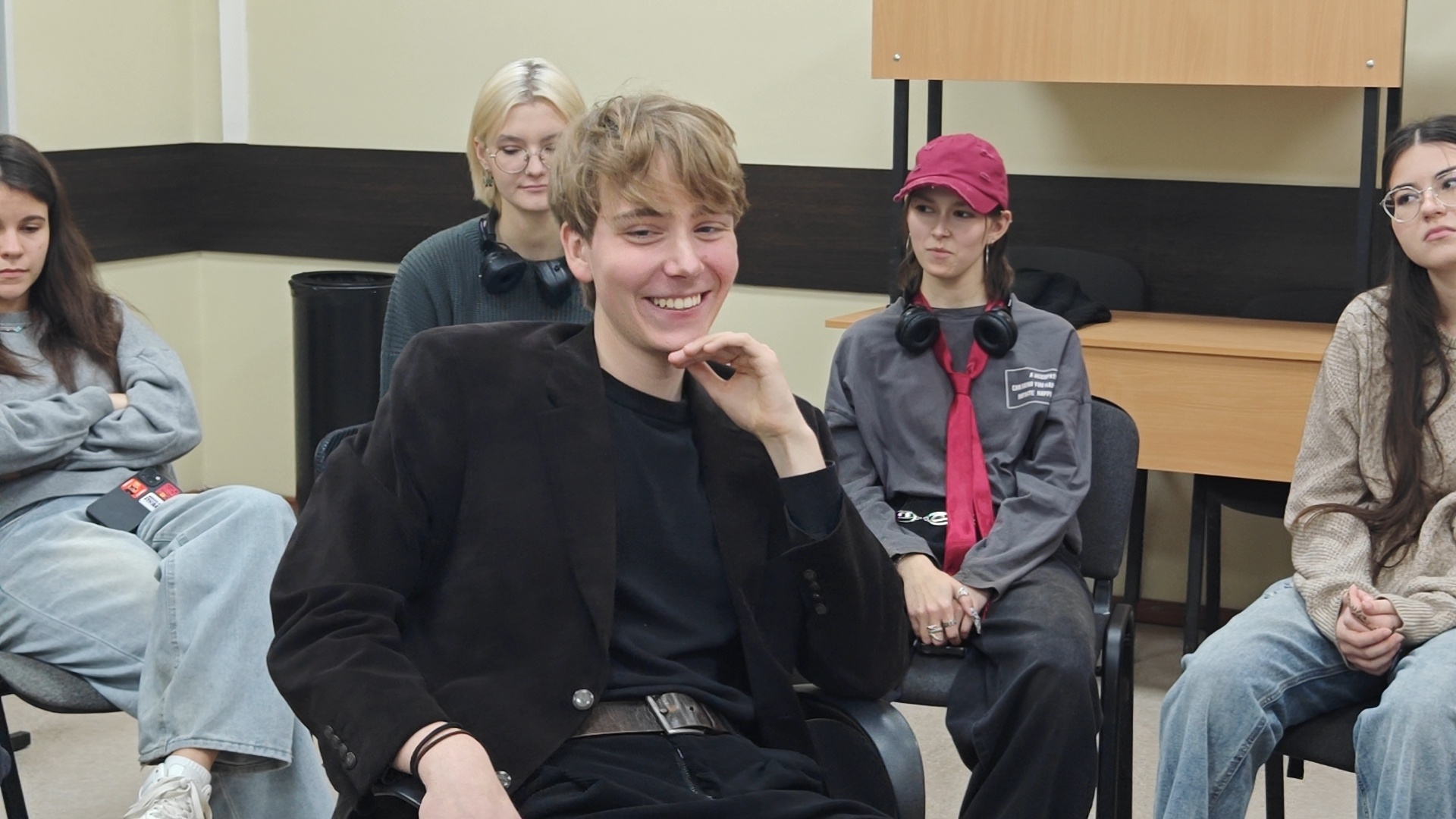 Вместо привычного формата «один спикер — один интервьюер» упражнение было построено на принципе круговой мизансцены. Респондент оказывался в центре, а вокруг — вся группа. Вопросы могли посыпаться от любого участника в произвольном порядке, создавая атмосферу живого, динамичного и непредсказуемого диалога.