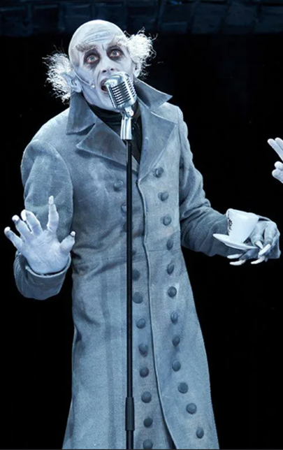 Костюмы и грим в этом спектакле невероятны. Чего стоят костюмы сов. Актеры с огромными головами сов и ярко-желтыми глазами. Абсолютно каждый актер на сцене загримирован, они все с белой как снег кожей. Из цветного — только глаза сов и их костюмы. В самом реквизите нет чего-то необычного: могилы, картонные деревья и фонари. Но забавным вышел, конечно, двойной велосипед в самом начале.