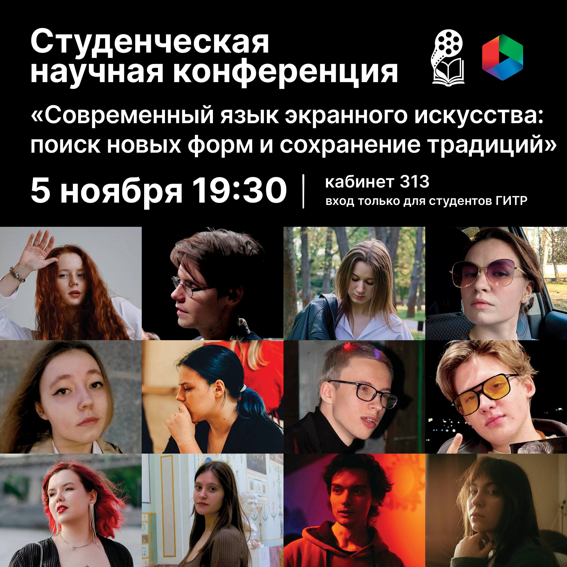Программа студенческой научной конференции «Современный язык экранного искусства: поиск новых форм и сохранение традиций». 5 ноября в 19:30 в 313 аудитории, факультет Режиссура кино и телевидения