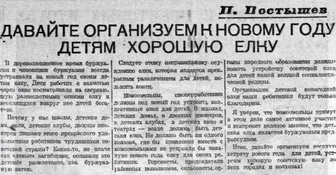 Перелом наступил в середине 1930‑х годов. По инициативе партийного деятеля Павла Постышева, опубликовавшего 28 декабря 1935 года в «Правде» призыв вернуть детям новогоднюю ёлку, было решено возродить зимний праздник уже в светском формате — как Новый год. Рождественское содержание убрали, но сама традиция ёлки и зимнего веселья с подарками получила «вторую жизнь».