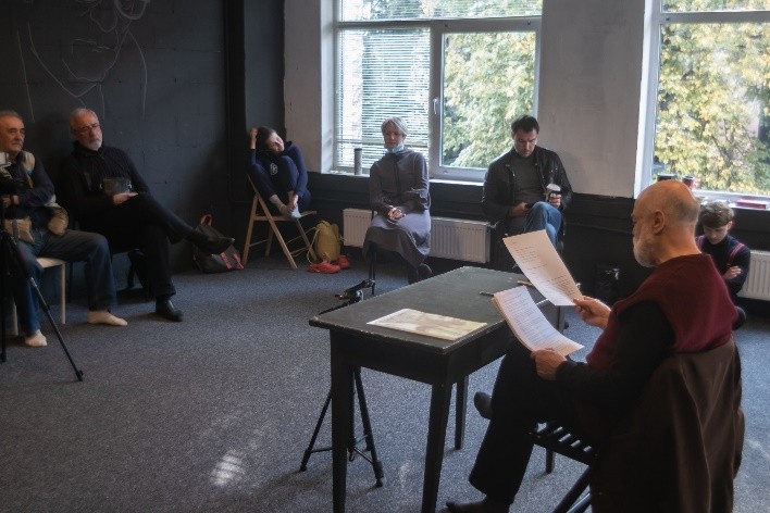 Пётр Глебович, Александр Валерьевич Суворов (преподаватель «Актерского мастерства» в ГИТРе) и труппа театра «Постскриптум» на репетиции. Фото: сайт театра