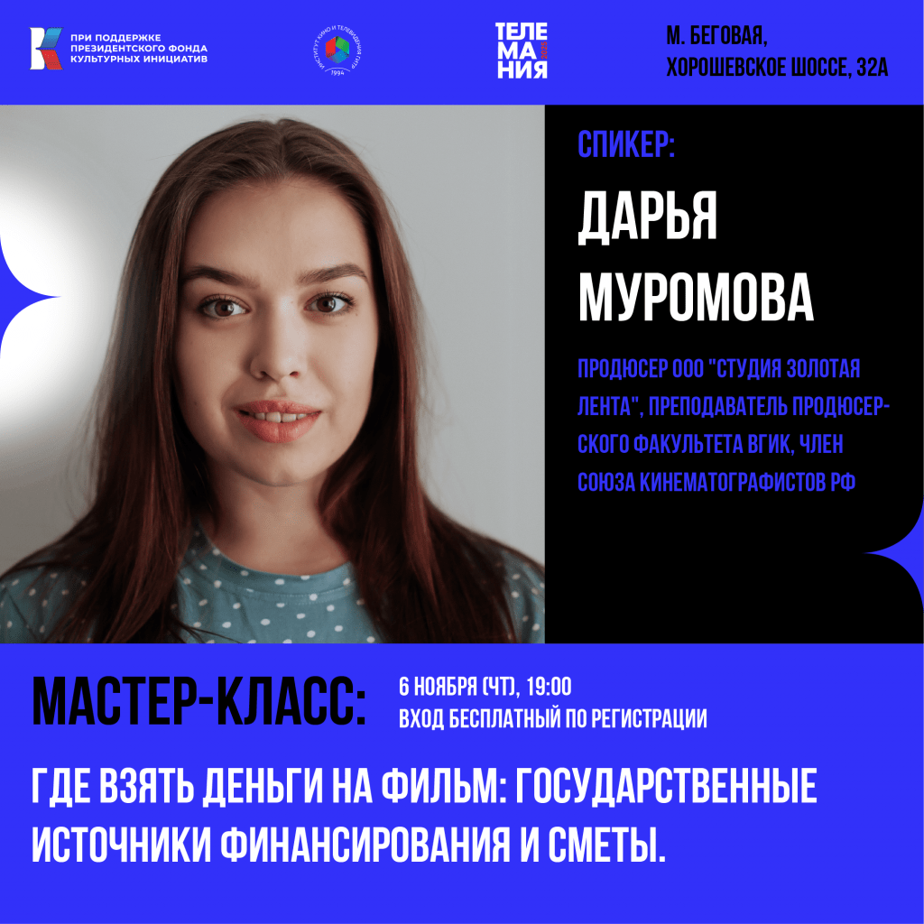спикер: Дарья Муромова, продюсер ООО «Студия Золотая Лента», преподаватель продюсерского факультета ВГИК, член Союза кинематографистов РФ