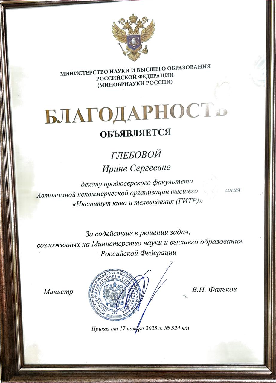 Декан продюсерского факультета, Ирина Сергеевна Глебова, получила Благодарность Министерства науки и высшего образования Российской Федерации. В тексте благодарности, подписанном министром, отмечается её заслуга «За содействие в решении задач, возложенных на Министерство науки и высшего образования Российской Федерации». Эта награда подчеркивает эффективную работу декана в организации специальных проектов и учебного процесса по подготовке медиа-специалистов в целях реализации государственной образовательной политики.