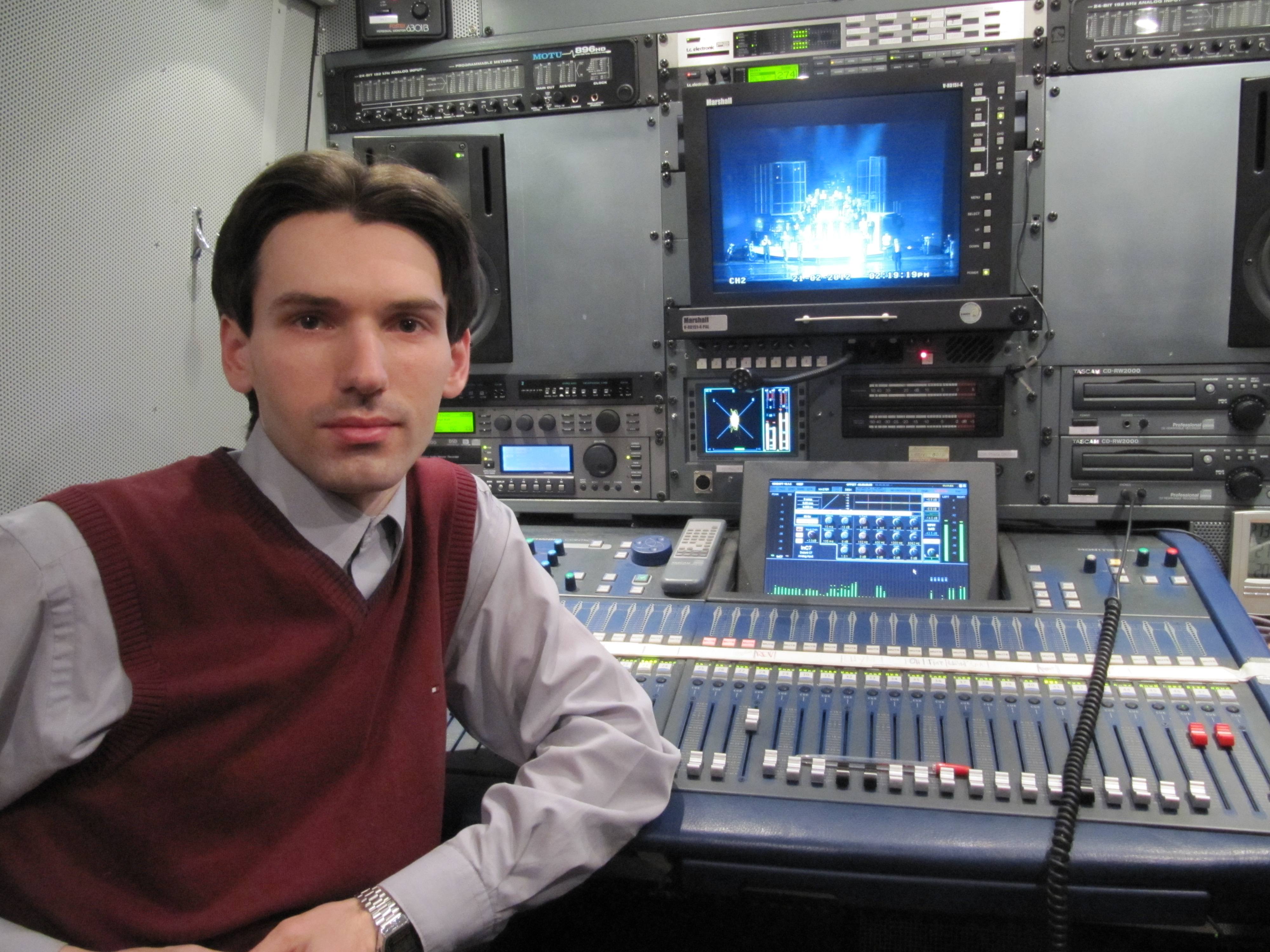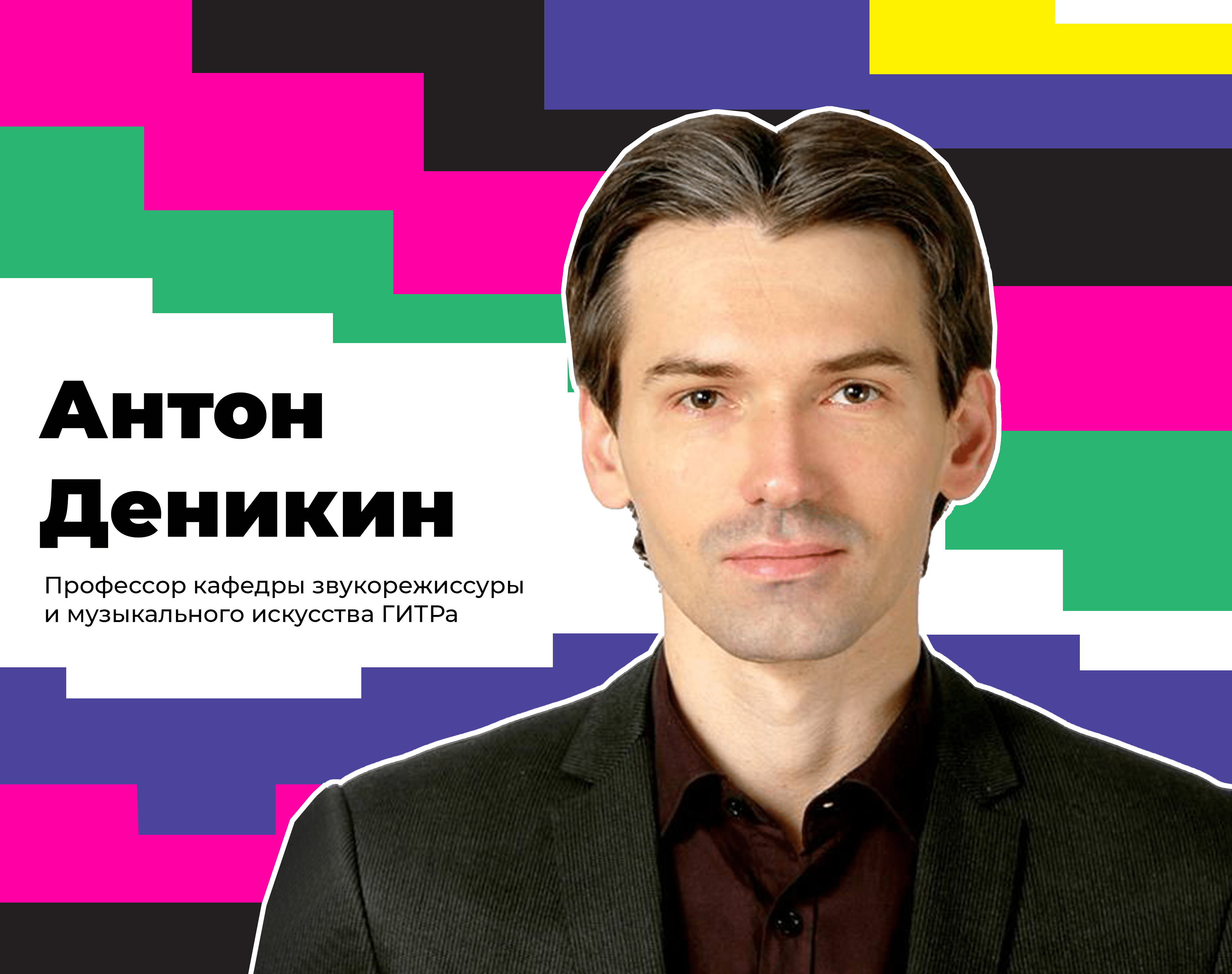 На вопрос абитуриента отвечает Антон Анатольевич Деникин, профессор, кандидат культурологии, звукорежиссер ВГТРК. Окончил РАМ им. Гнесиных и аспирантуру ГИТРа, лауреат всероссийских и международных фестивалей, член Союза театральных деятелей. Преподает «Технологию дизайна звука», «Слуховой анализ», «Искусство музыкальной фонографии».