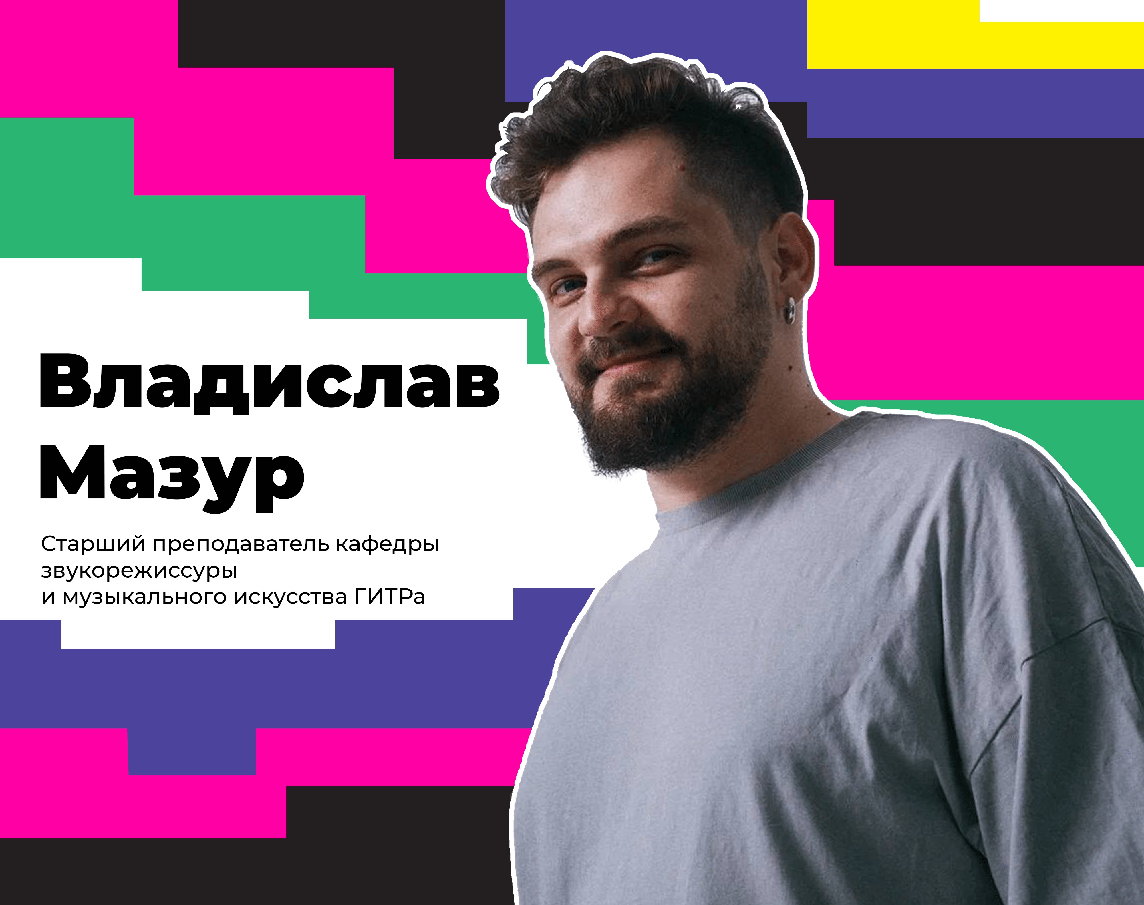 На вопросы абитуриента отвечает Владислав Валерьевич Мазур. Музыкальный продюсер, саунд-дизайнер, звукорежиссер. Основатель Chuvakam Студии. Сотрудничал с брендами Dostavista, Outventure, Искренне Ваш, Северсталь, Radiotube, Комус, Ноприз, Tecno. Выпускник факультета мировой политики МГУ им. Ломоносова по специальности «Специалист международных отношений», выпускник отделения ДПО ГИТРа по специальности «Звукорежиссура аудиовизуальных искусств». Преподает «Современные аудиотехнологии, Logic».