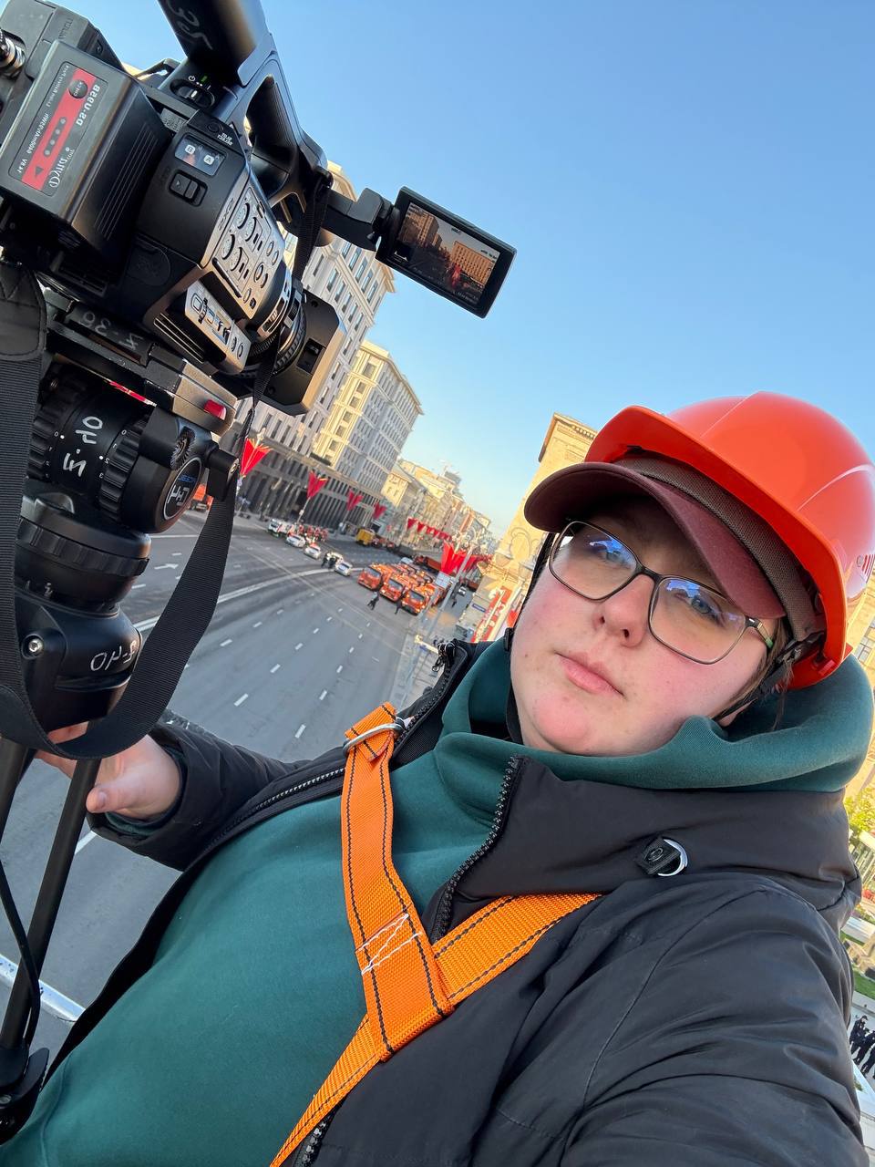 Работа проходила около концертного зала Чайковского на Тверской на скайлифте на высоте примерно 18 метром. Мне нужно было снять как техника подъезжает к Красной площади. На Тверской я была в 3 утра, с 5:20 до 8 утра был стрим. Сложность такой работы заключается в том, что нет связи с режиссером, который говорит, когда ты в эфире. Постоянно нужно снимать под эфир. Ты чувствуешь огромную ответственность. Пока стрим не закончился, я не могла думать ни о чем кроме съёмки. И только после того, как ты все отснял, доехал до редакции, потом до дома и поспал, только тогда чувствуешь удовлетворение от работы.